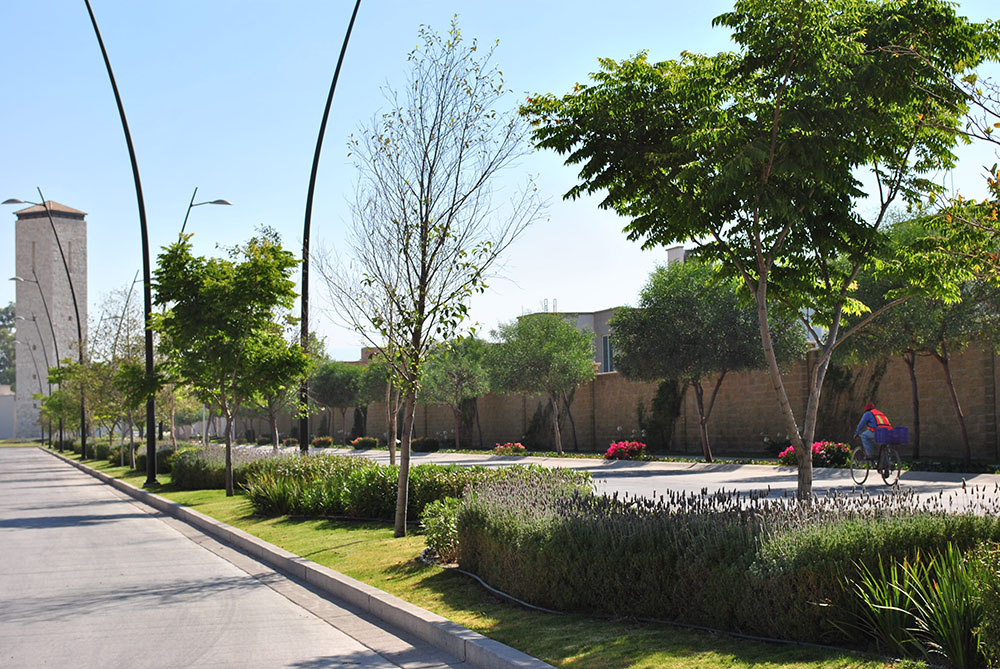 A lo largo de nueve años hemos desarrollado 10 privadas, camellones, accesos y glorietas con las siguiente paleta vegetal; árboles de tipo fresno, álamo, álamo sicomoro, encino verde ,encino rojo, fraile, pirul, acacia, sangre libanesa, flama china, aliso, olmo chino, sauce llorón, sabino, jacaranda, entre otros; Arbustos de tipo lirio persa, viburio, agapando, clavo, clavo enano, perovskia, lavanda, juníperos, romero, fornio, duranta, rosa laurel, galvia, niña en barco, llamarada y pastokikuyo como cubre suelos.