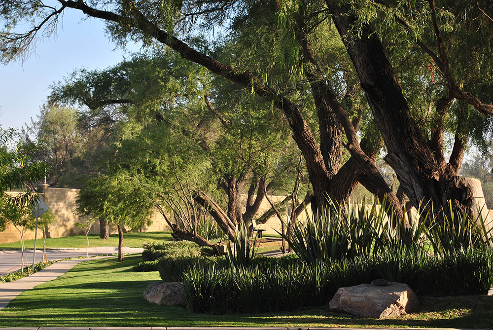 El sitio ya contaba originalmente con pirules y mezquites adultos, que se respetaron en el diseño urbano, siendo estos el principal elemento de la arquitectura de paisaje.